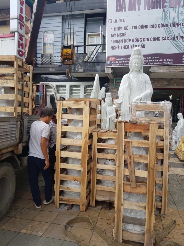 • Thứ 6: Qúa trình đóng gói, và vận chuyển lắp đặt cũng được thực hiện rất chuyên nghiệp và cẩn thận, vì những pho tượng đức mẹ đẹp này làm bằng đá, trọng nượng thành phẩm nặng gấp mấy trăm, tới mấy ngàn lần so với các tượng đúc bằng keo poli hay xi măng, thạch cao cùng kích thước.
